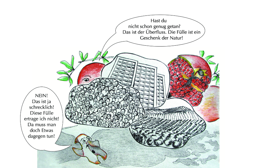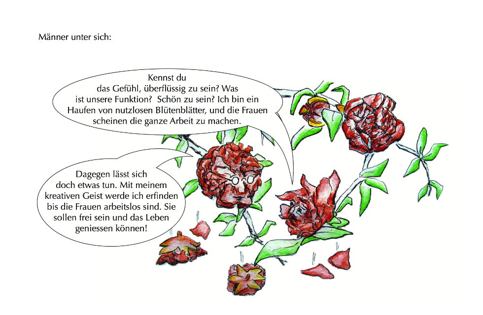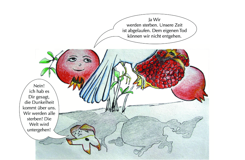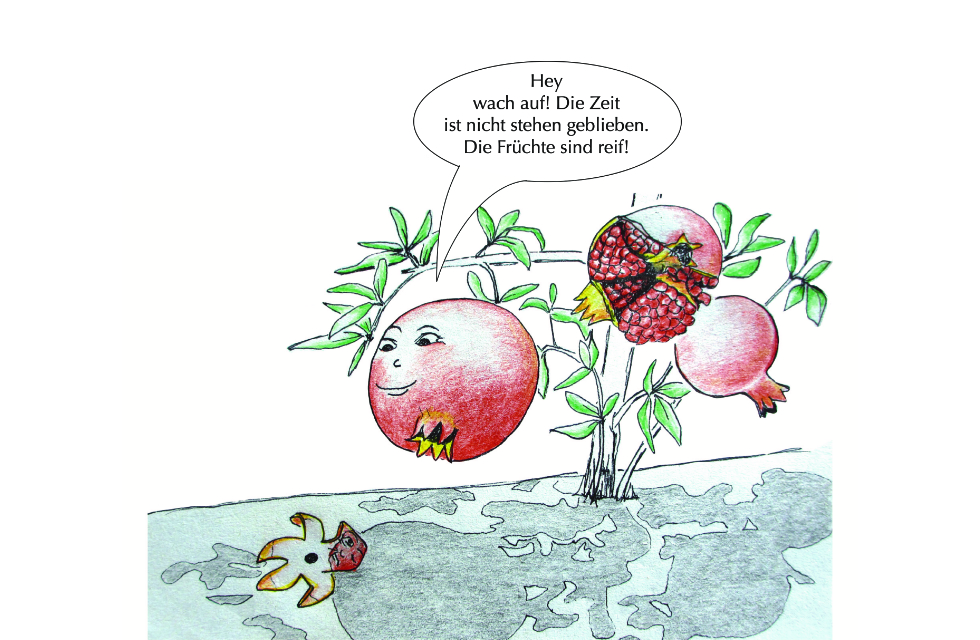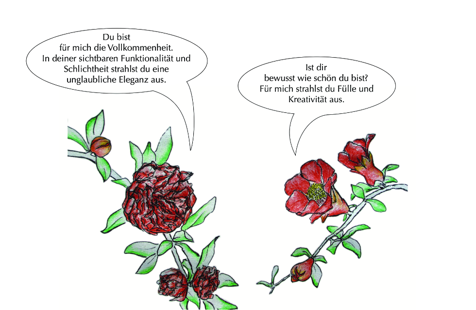 Die Geschichte entstand auf grund der Beobachtung, dass es beim Granatapfel männliche und weibliche (zwittrige) Pflanzen gibt. Die Blüten der männlichen Pflanz bestehen nur aus Blütenblätter und sind wunderschön. Die “weiblichen” Blüten enthalten sowohl männliche als auch weibliche Fortpflanzungsorgane und entwickeln sich nach erfolgreicher Bestäubung zu Früchten.