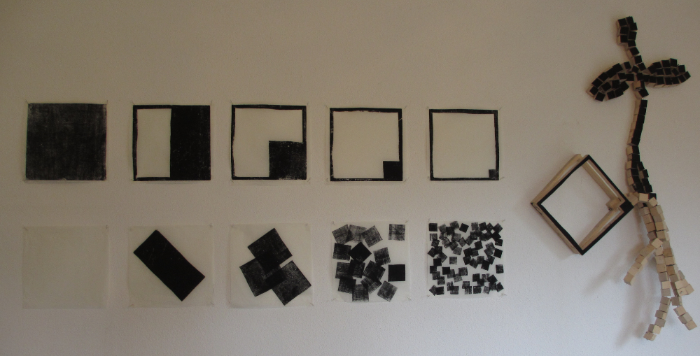 Aus dem quadratischen Stück Holz wurde immer die Hälfte rausge- schnitten. Die entstehenden Formen wurden auf Papier als Holzdruck dokumentiert.