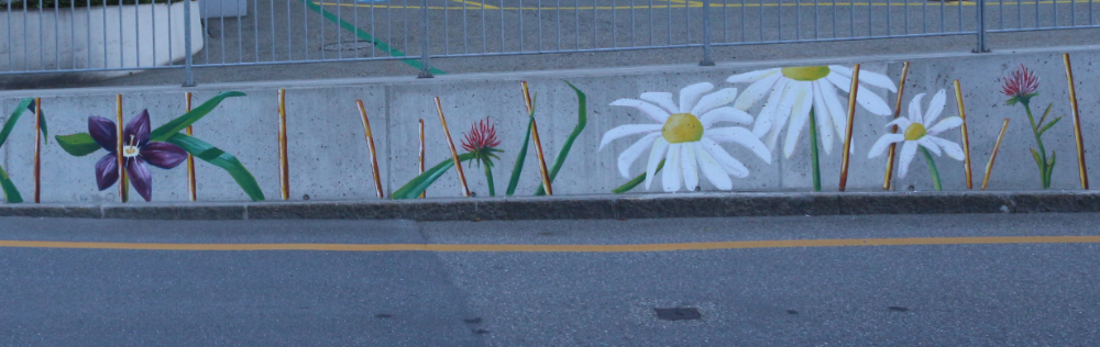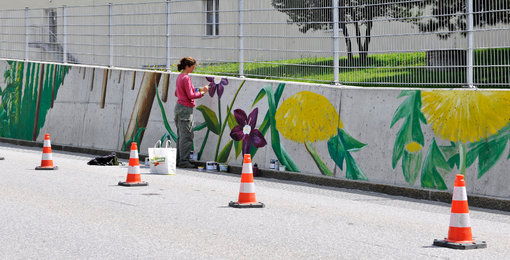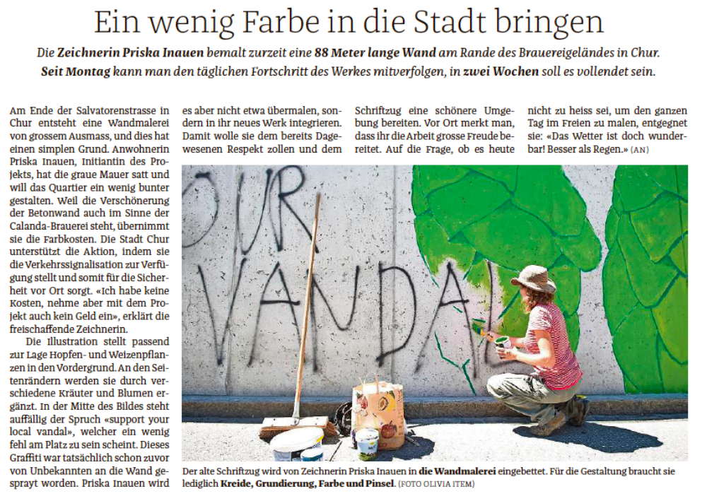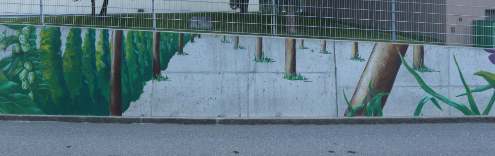 Wandgestaltung auf einer knapp 90m langen Betonstützmauer, im Eigentum der Firma Heineken AG, an der Salvatorenstrasse in Chur.