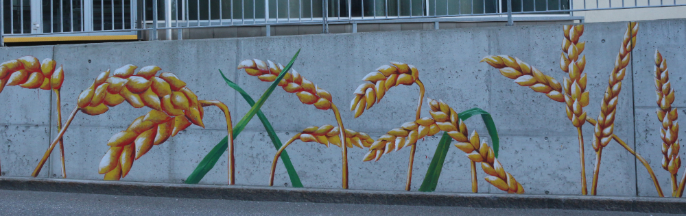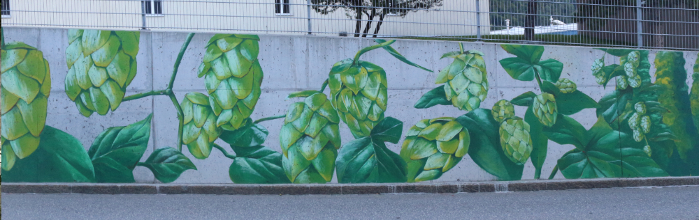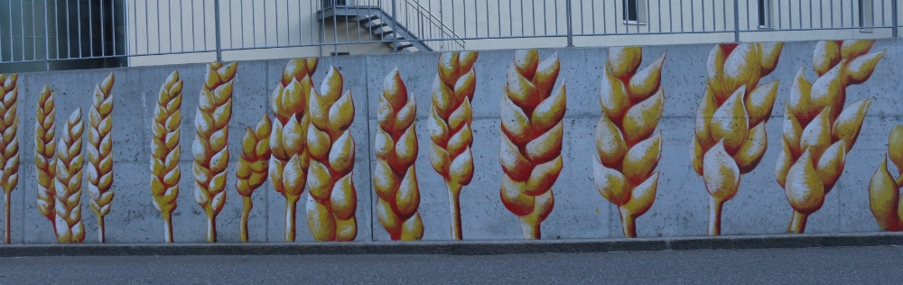 Um Bezug zum Ort herzustellen wählte ich Getreideären und Hopfen. Die bunten Unkräuter die das Bild abchliessen stehen stellvertretend für Kreativität die oft an der Peripherie gedeiht.